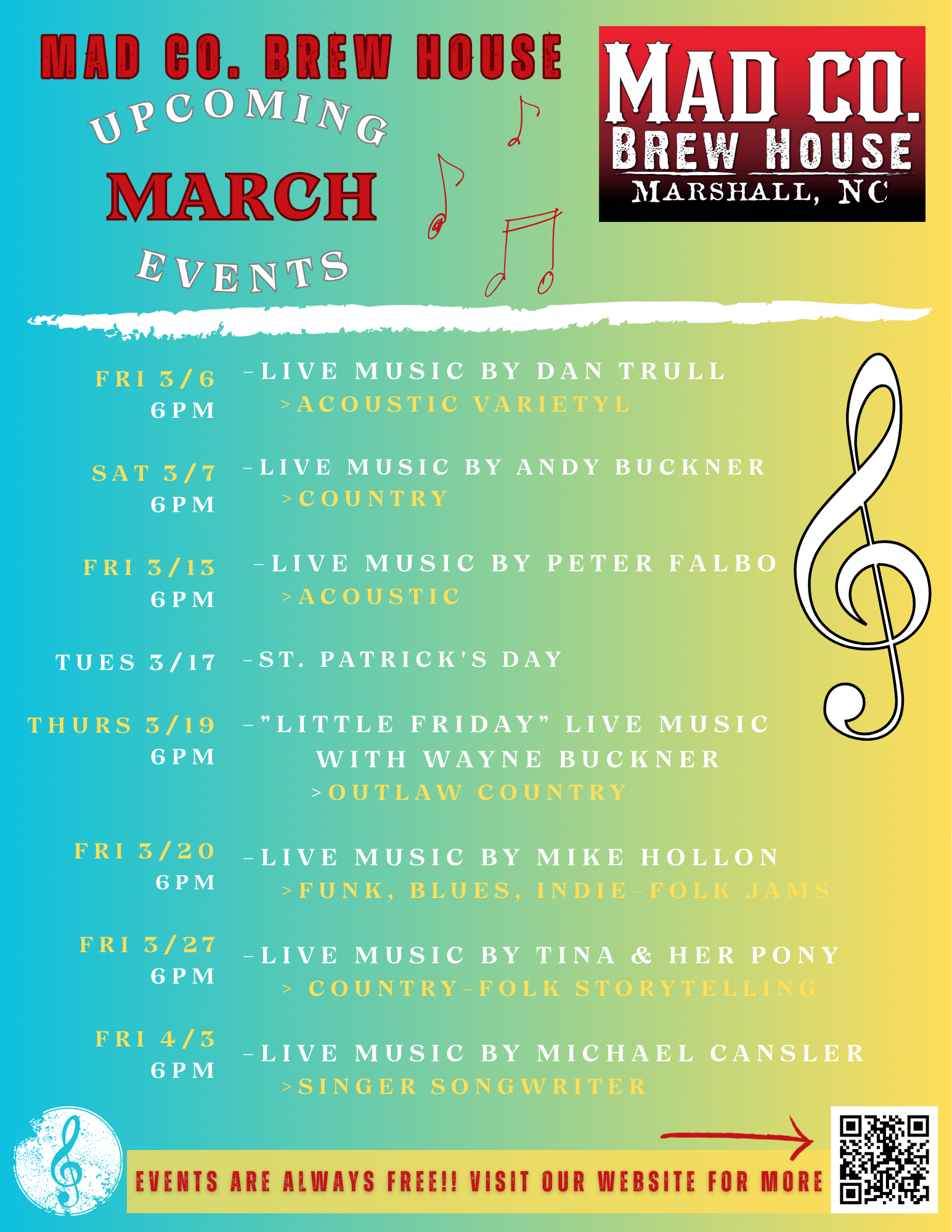 Please check out our Events on our Facebook page for the latest updates: Mad Co. Brew House | FacebookIf you are interested in performing at Mad Co. Brew House, please send us an email at info@madisoncountybrewing.com